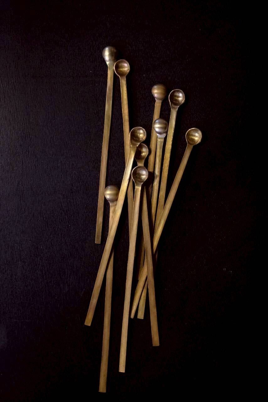 伝統的な鍛金技法でアルミ、真鍮で作品を製作を行う山田憲栄さんの真鍮の長めのマドラースプーンです